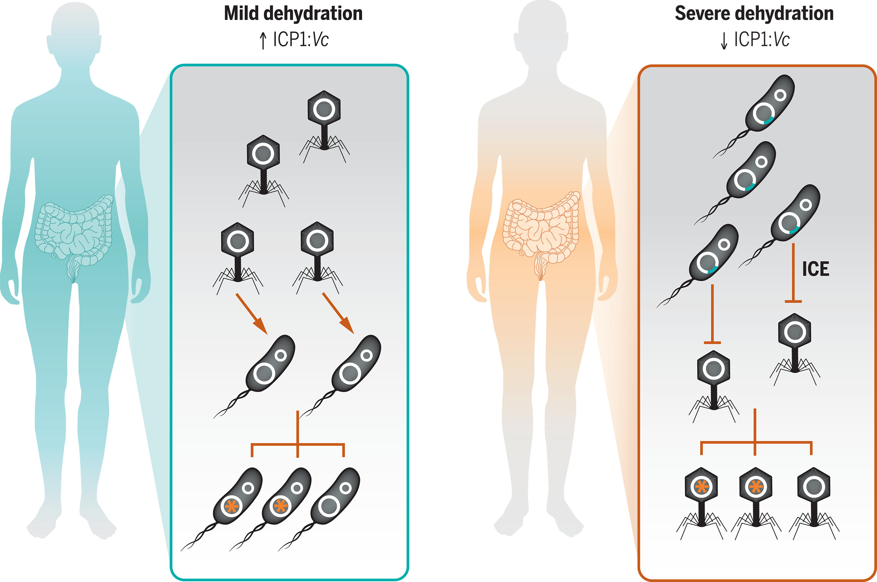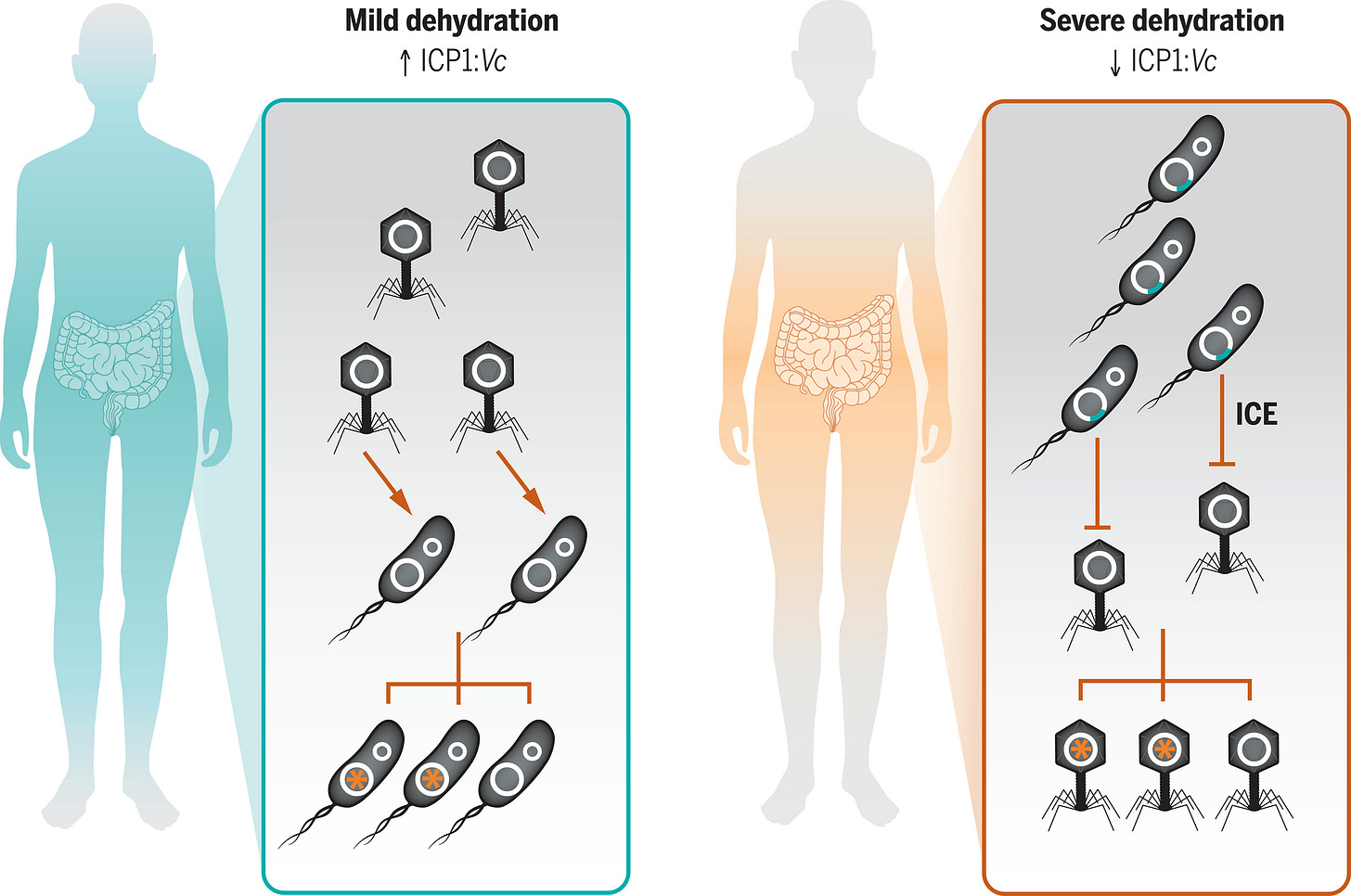 The authors found that heightened ratios of phage:bacteria, in this case the virulent phage ICP1 and the bacterium V. cholerae, correlated with milder dehydration, while lower ratios were linked to moderate to severe dehydration. They also investigated the influence of integrative conjugative elements (ICEs), which encode phage resistance genes, on predation dynamics. Patients lacking detectable ICEs exhibited higher predator-to-prey ratios, termed "effective predation," while the presence of specific ICE variants was associated with resistance to ICP1.