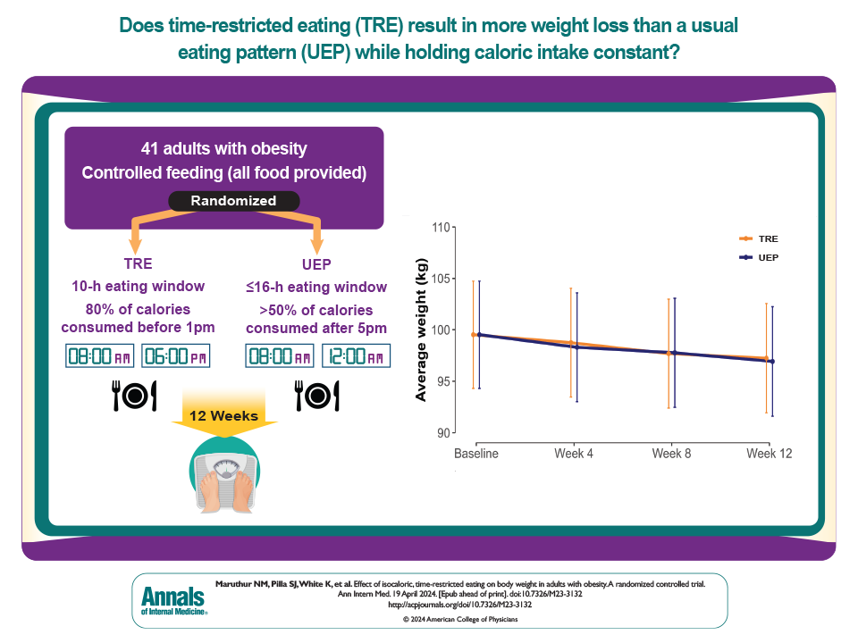 To address these gaps, a recent randomized controlled feeding study compared the effects of TRE versus a usual eating pattern (UEP) over 12 weeks in individuals with obesity and prediabetes or diet-controlled diabetes. Surprisingly, despite consuming the same amount of calories, participants following TRE did not experience greater weight loss or improvements in glycemic measures compared to those following UEP. These results suggest that any observed benefits of TRE on weight management in previous studies may be due to reduced calorie intake rather than specific effects of eating timing.